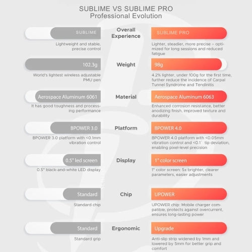 Inspirat din designuri ergonomice premium și construit pentru performanță reală în lucru, SUBLIME PRO oferă control „pixel cu pixel”, vibrații minime și adaptabilitate completă pentru toate tehnicile moderne PMU.