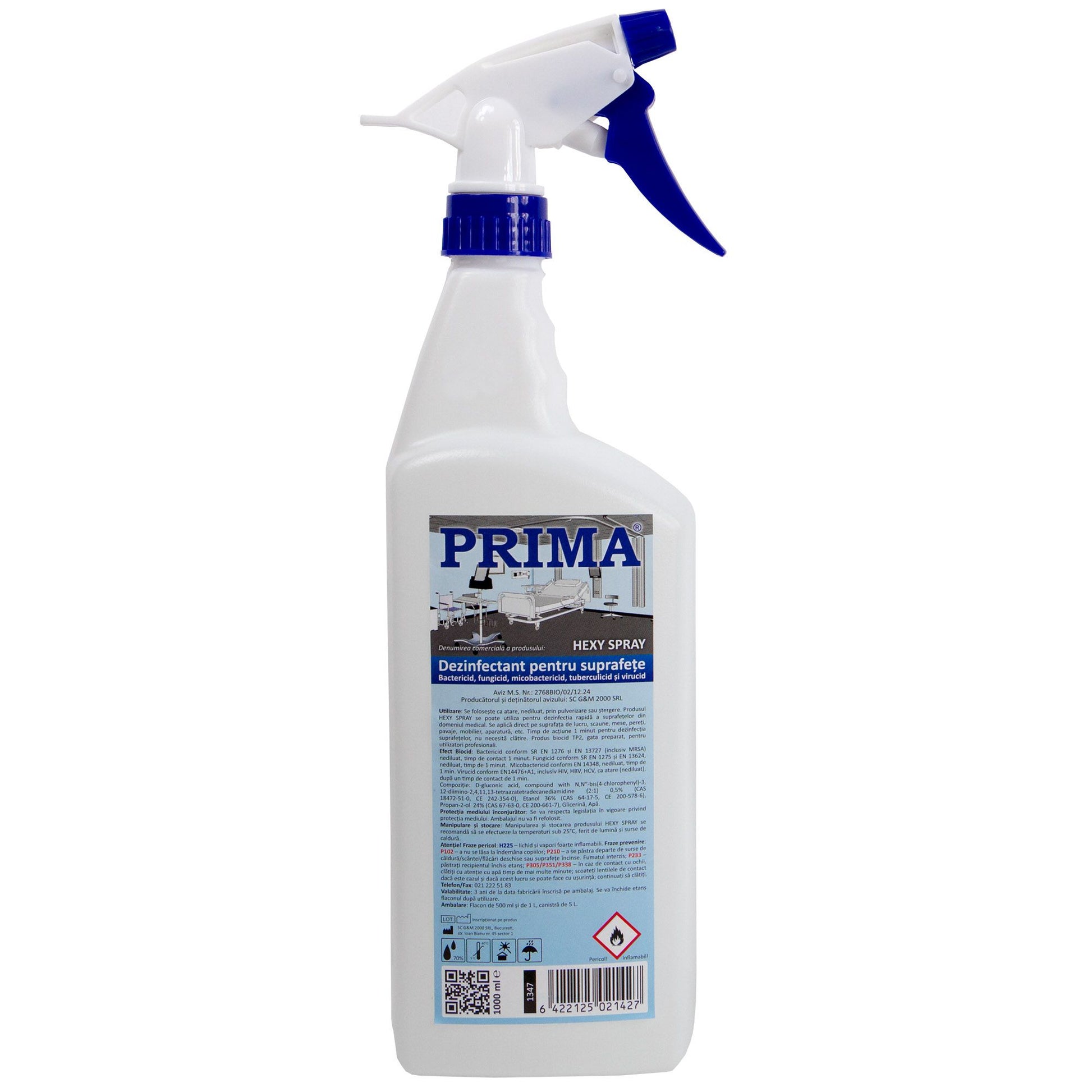 Dezinfectant pentru suprafete PRIMA – Hexy Spray este un produs bactericid, fungicid, micobactericid si virucid. Contine flacon cu spray, gata de utilizare. Se foloseste ca atare, nediluat. Pentru utilizatori profesionali. Se foloseste in domeniul medical, la dezinfectia suprafetelor, peretilor, pavajelor, aparaturii medicale, mobilierului. Bactericid conform SR EN 1276, EN 13727 (inclusiv MRSA) nediluat timp de 5 min. Fungicid conform SR EN 1275, EN 13624 nediluat timp de 5 min. Micobactericid conform EN 14348, nediluat timp de 1 min. Virulicid conform SR EN 14476 + A1 ca atare (nediluat), dupa un timp de contact de 1 minut, la temperatura de 20˚C pentru Adenovirus, Poliovirus, HIV, HCV, HBV.